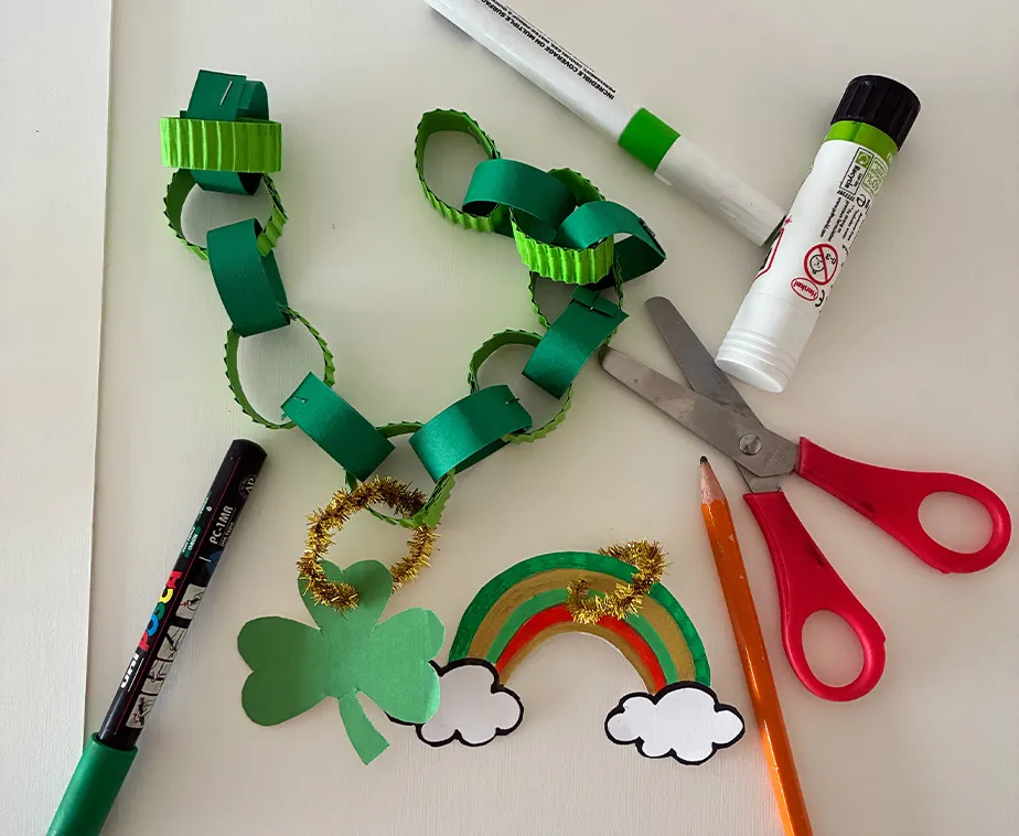 Let’s get ready for St. Patrick’s Day celebrations by creating a paper chain decoration adorned with shamrocks, leprechauns and other festive symbols.